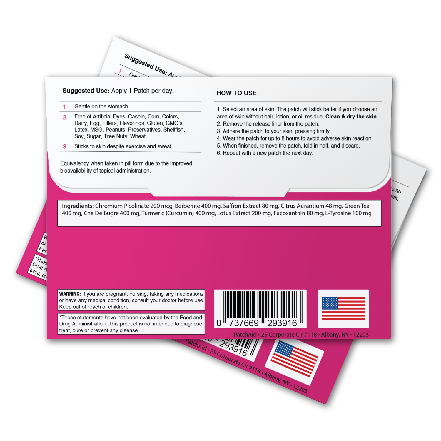 The Slim Trim Appetite Suppressant Patch contains ingredients that reduce appetite and support metabolism. Green tea extract helps curb hunger and boost metabolism. Brown seaweed (fucoxanthin) and lotus leaf extract may support weight loss and hunger reduction, while saffron and other ingredients improve mood. This patch also contains chromium picolinate, which supports insulin action and blood sugar control. Key Benefits: • Supports appetite control and helps curb hunger. • Promotes metabolism with Green Tea Extract and fucoxanthin. • Includes chromium for insulin support and blood sugar regulation. PatchAid vitamin patches are Latex, Lactose, Gluten & Sugar-free