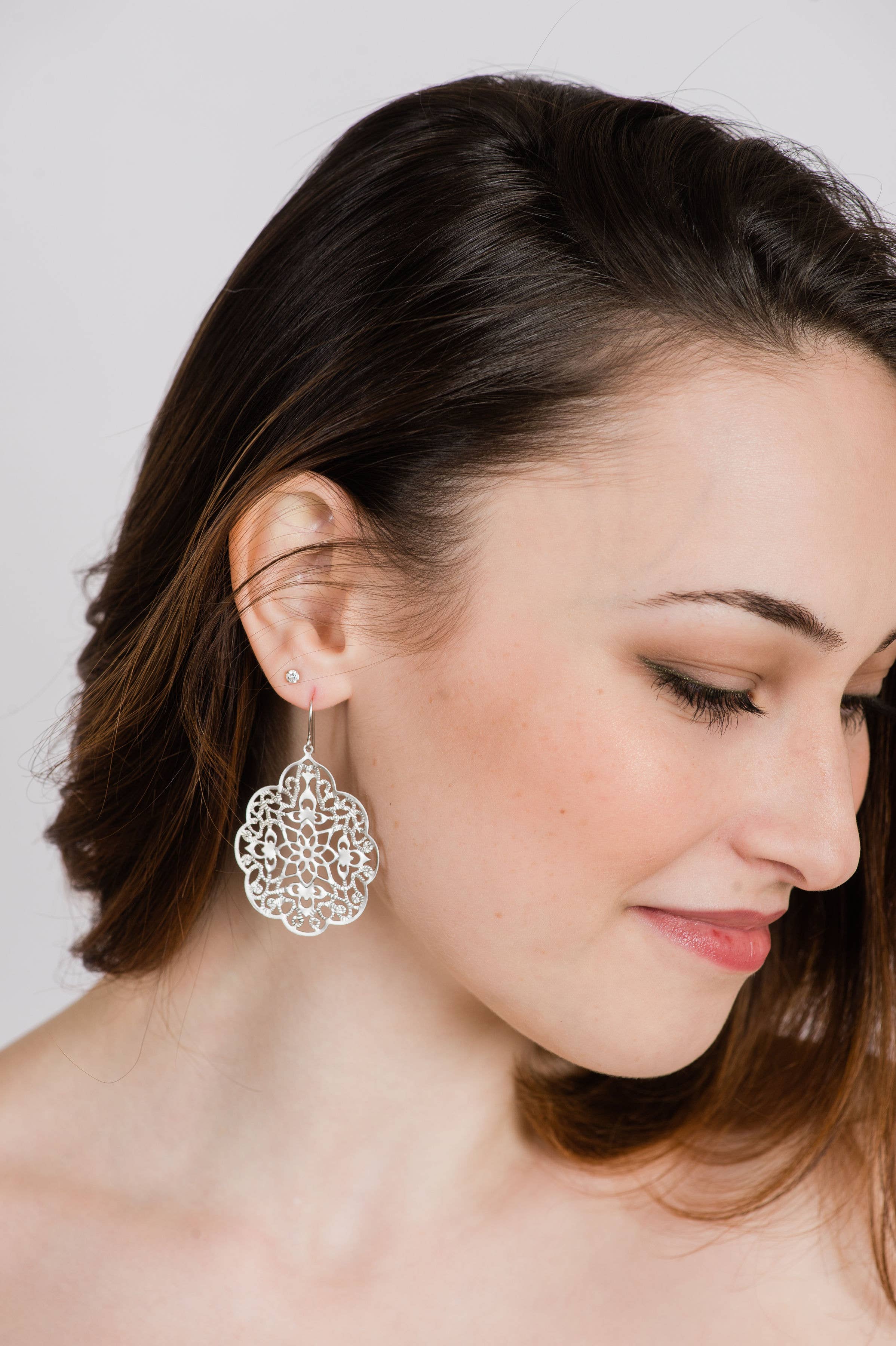These are gorgeous silver filigree earrings! The Spanish lace design has intricate details and scalloped edges. These large dangle earrings are silver plated and have simple fish hook ear wires. Lightweight and easy to wear all day, these are gorgeous statement accessories that are easy to pair with any outfit. These earrings measure approximately 2.5 inches and the filigree drops are approximately 1.5 inches x 2 inches (36 mm x 46 mm).