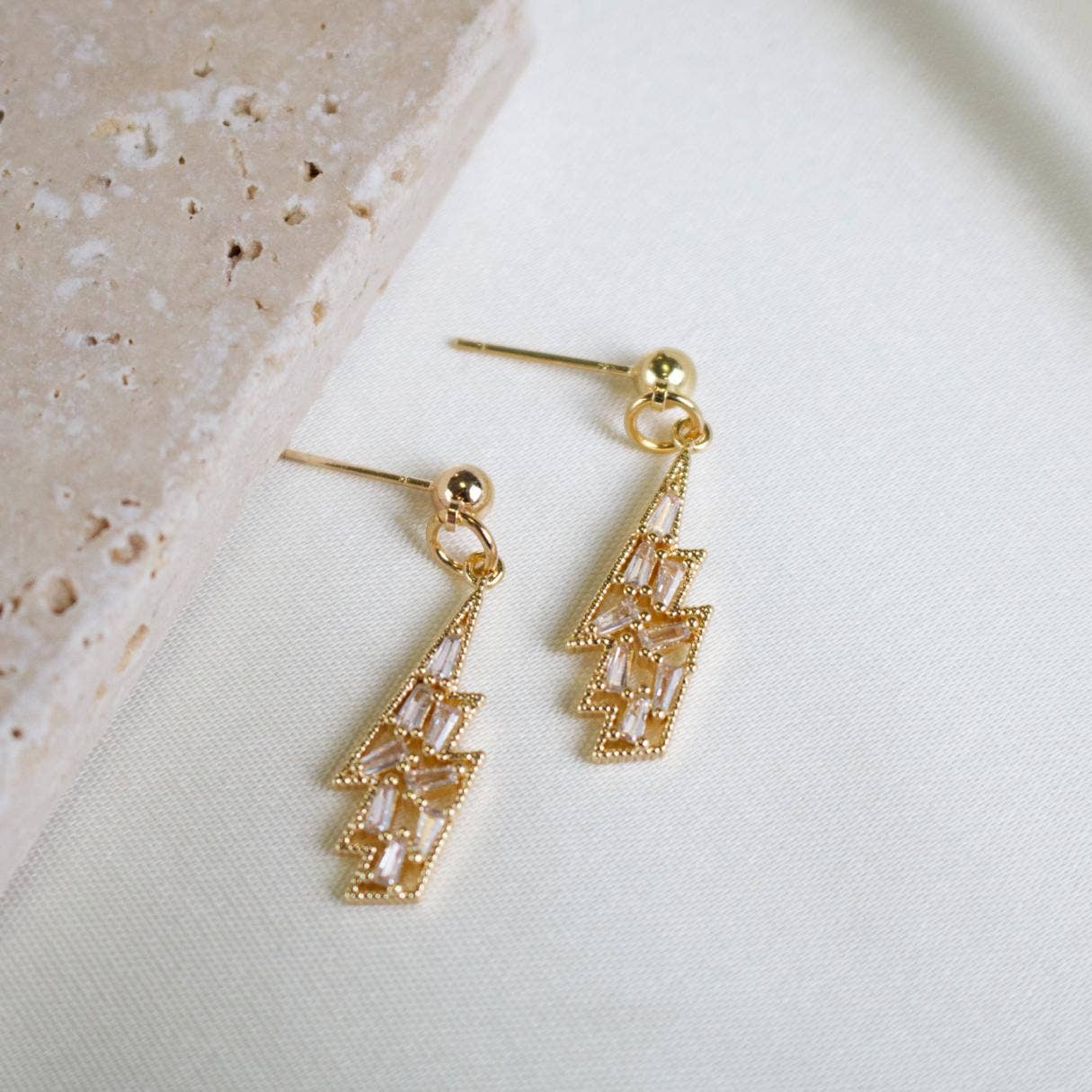 Make a statement with the Zen lightning bolt stud earrings. A rhinestone encrusted lightning bolt on a gold ball stud. Perfect to wear alone, or to add to your ear stack! Product Features: • Rhinestone encrusted lightning bolt charm • Gold plated brass ball stud - nickel free • Length of earring from top of hook to bottom of charm is approximately 1.25"  JEWELRY CARE: To prolong the life of your jewelry, avoid contact with water, perfume, lotions etc. This will ensure your jewelry remains wearable for a long time All pieces of TISH jewelry are carefully designed and curated in Hamilton, ON.